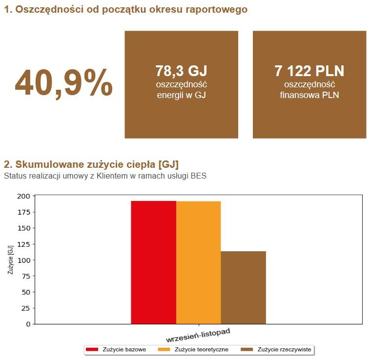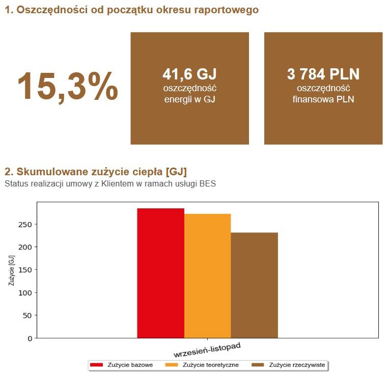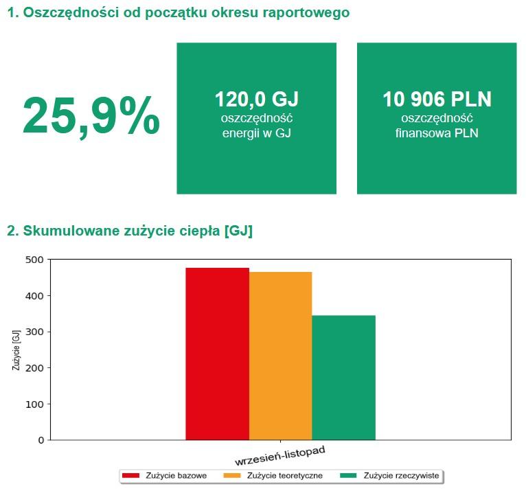 Raport dotyczy oszczędności uzyskanych dla CO (Centralnego Ogrzewania) i CWU (Ciepłej Wody Użytkowej – podgrzania wody).