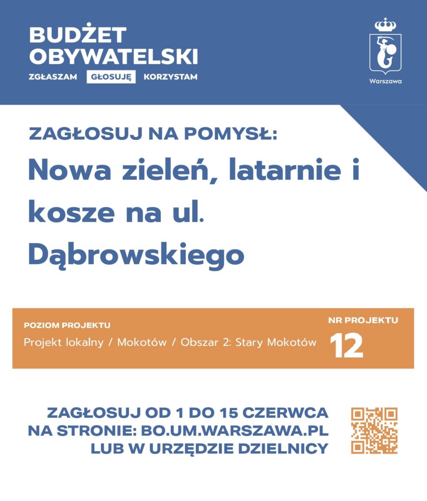 Projekt nr 1 Zielona Wołoska i Stary Mokotów – Projekt nr 12 Nowa zieleń, latarnie i kosze na ul. Dąbrowskiego.
